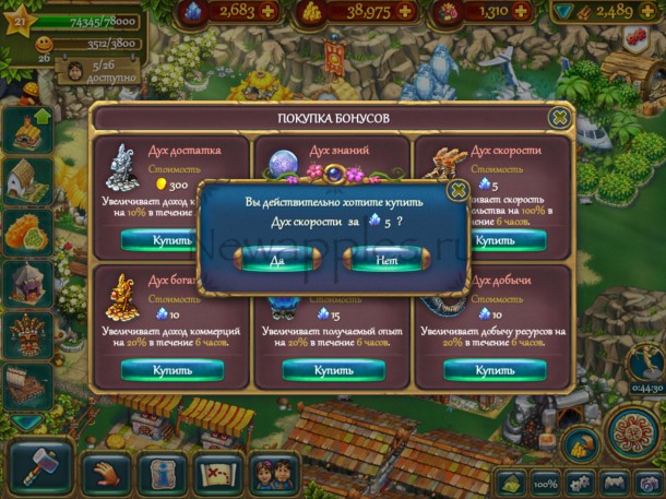 Раз уж мы заговорили о бонусах, отметим, что за несколько золотых монет или кристаллов, вы можете приобрести некоторые бонусы, которые позволят вам увеличить доход с коммерции, добычу ресурсов и опыта, скорость строительства, …
