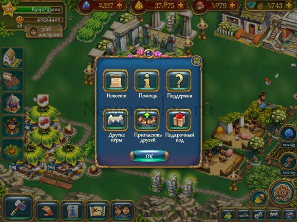 В меню игры вы сможете узнать новости, пригласить друзей, обратиться к помощи по самой игре или ввести подарочный код, который добавит на ваш счёт определённое количество золотых монет, кристаллов или бонусных предметов.