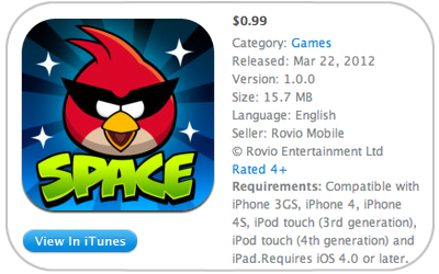 Как и ожидалось, Angry Birds Space выпущена в двух версиях, для iPhone и iPad и в настоящее время уже доступна в App Store по цене $ 0,99 и $ 2,99 соответственно.