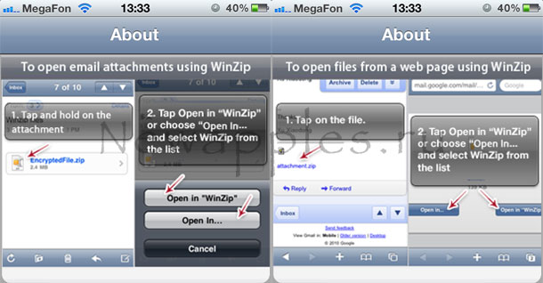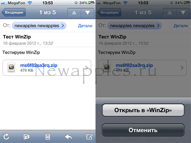 Чтобы открыть Zip-файл, например в почтовом вложении, необходимо тапнуть на него, а затем выбрать «Открыть в «WinZip»».