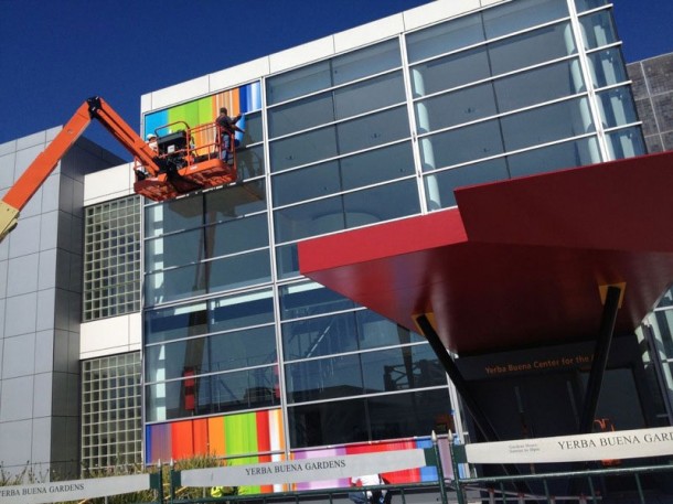 А вот уже на внешнем фасаде Yerba Buena Center начинают размещать главный баннер.