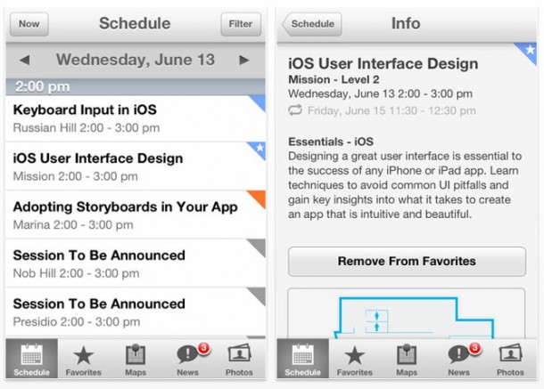 Наконец, Apple в очередной раз выпустила бесплатное приложение WWDC, которое поможет посетителям конференции более подробно изучить расписание мероприятий. В этом универсальном приложении можно будет найти свежие новости, фотографии с места событий, подробную карту Moscone Center и многое другое.