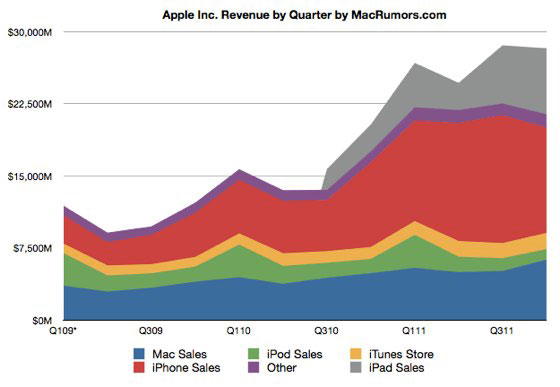 Apple продала 4,89 млн компьютеров Macintosh в течение этого квартала, что на 26% больше по сравнению с тем же кварталом прошлого года. Квартальный объем продаж iPhone достиг 17,07 млн единиц, что на 21% больше по сравнению с четвёртым кварталом прошлого года, а также 11,12 млн единиц iPad — на 166% больше по сравнению с этим же кварталом прошлого года. Единственное устройство, продажи которого продолжают сокращаться, являются плеера iPod, которых в четвёртом квартале текущего года было продано 6,62 млн единиц, что на 27% меньше по сравнению с четвёртым кварталом прошлого года.