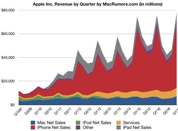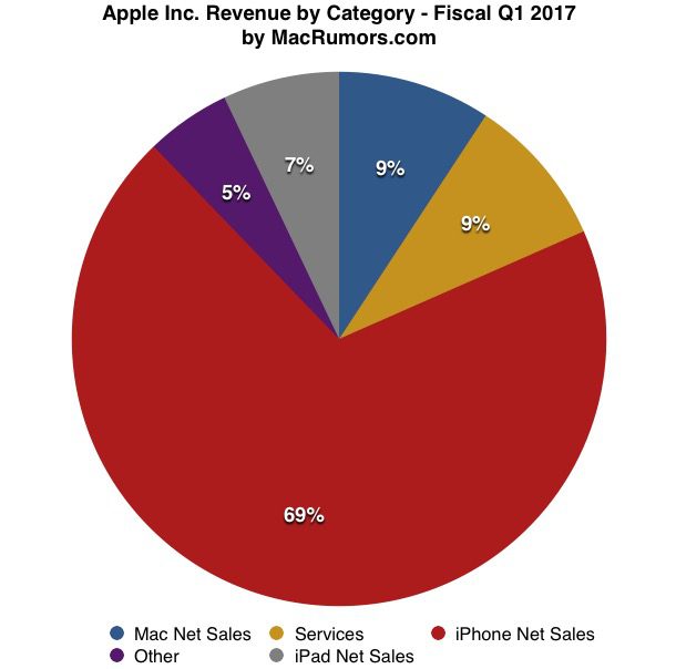 Только что глава Apple Тим Кук и её финансовый директор подвели итоги работы компании за первый финансовый квартал 2017 года и четвёртый календарный квартал 2016 года. В частности, руководство Apple сообщило о доходе компании за предыдущие три месяца, который составил $78,4 млрд. и чистой квартальной прибыли в размере $17,9 млрд. или $3,36 за акцию, по сравнению с доходом $75,9 млрд. и чистой квартальной прибылью в размере $18,4 млрд. или $3,28 за акцию, за аналогичный квартал прошлого года.