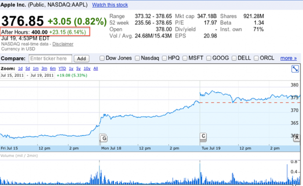 «Мы очень довольны нашей деятельностью, которая позволила увеличить поток денежных средств от всех операций на 131% по сравнению с аналогичным периодом прошлого года», сказал Питер Оппенхаймер (Peter Oppenheimer), финансовый директор Apple. «Заглядывая вперед, в четвертом финансовом квартале 2011 года, мы ожидаем доход около $ 25 миллиардов и прибыль на акцию в размере около $ 5,50.»