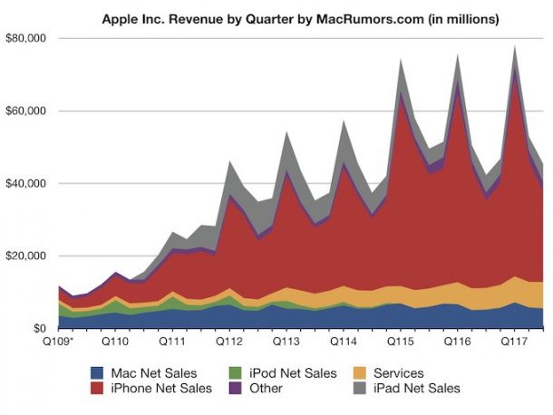 В минувшем квартале были отгружены 41 млн. iPhone, что немного больше по сравнению с тем же кварталом прошлого года, когда было продано 40,4 млн. единиц смартфонов Apple. Количество реализованных компьютеров Mac увеличилось до 4,29 млн. единиц, по сравнению с 4,25 млн. «маков», проданных годом ранее. За счёт появления на рынке новых моделей iPad Pro, продажи планшетов Apple наконец-то выросли (на 28% по сравнению с предыдущим кварталом и на 15% по сравнению с прошлым годом). В минувшем квартале их было реализовано 11,42 млн. единиц, в то время как в аналогичном квартале прошлого года Apple отгрузила 9,95 млн. iPad разных моделей.