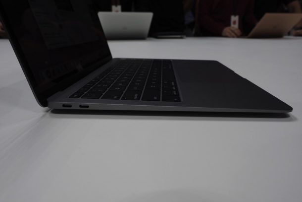 Первой новинкой, показанной на октябрьской презентации Apple, стал полностью обновлённый ноутбук линейки MacBook Air. Новая модель MacBook Air стала тоньше и легче своих предшественников, получила дисплей Retina с разрешением 2560×1600 пикселей, Touch ID, клавиатуру нового поколения, два порта Thunderbolt 3 (USB‑C) и трекпад Force Touch, а также стала самым экологичным Mac за счёт корпуса из переработанного алюминия.