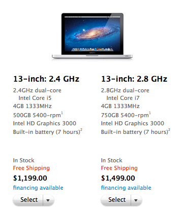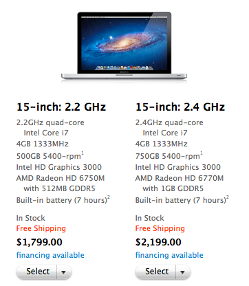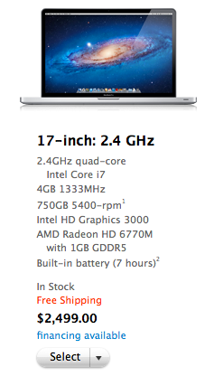 ? Четырехъядерный процессор Intel Core i7 2.4 ГГц, Radeon HD 6770M (1 Гб), Intel HD Graphics 3000, 4 Гб оперативной памяти, жесткий диск 750 Гб, слот для карт SD, слот Express Card — $ 2,499