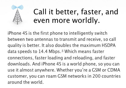 «В специальных тестах iPhone 4S, которые дублируют те, которые мы провели на iPhone 4, новый смартфон не проявлял тот же недостаток приема сигнала, который выражался в потере сигнала при определённом прикосновении к антенне в нижней левой части телефона во время нахождения в области со слабым сигналом. (iPhone 4, который по-прежнему доступен, продолжает демонстрировать наличие этой проблемы. Из-за этого дефекта, мы продолжаем снижать рейтинг iPhone 4 в нашем списке рекомендуемых моделей)».