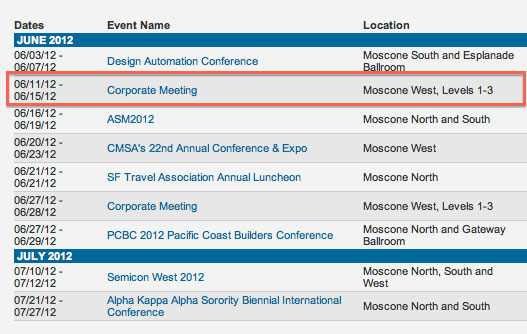 В принципе, информация о предположительной дате проведения WWDC 2012 не является новой. Ещё в июне прошлого года, сразу же после окончания WWDC 2011, мы отмечали, что очередная конференция для разработчиков может состояться с 11 по 15 июня, так как именно на эти дни в календаре Moscone Center, где Apple обычно проводит это мероприятие, значится «корпоративная встреча».