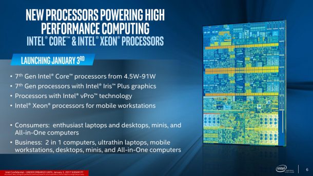 В четверг, 5 января, в Лас-Вегасе стартовала международная выставка потребительской электроники CES 2017, но ещё до её открытия многие ведущие производители успели анонсировать свои новинки. Одним из них стал американский производитель электронных устройств и компьютерных компонентов компания Intel, который в так называемый «нулевой день» официально анонсировал всю линейку процессоров Intel Core седьмого поколения, более известных под кодовым названием Kaby Lake.