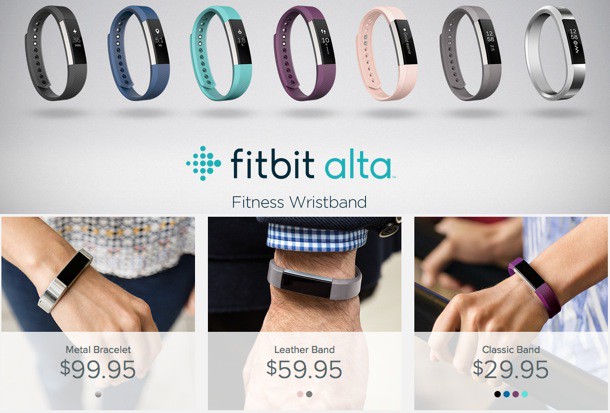Fitbit Alta с корпусом из нержавеющей стали предлагается с классическими эластичными ремешками черного, синего, фиолетового и голубого цвета. К фитнес-трекеру также можно отдельно приобрести ремешки такого же цвета, либо отдельно заказать кожаные ремешки розового и графитового цвета или металлический браслет. Стоимость классического ремешка составляет $29.95, кожаного — $59.95, а металлический браслет продаётся по цене $99.95.