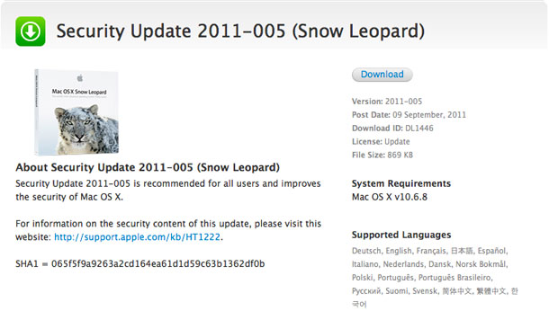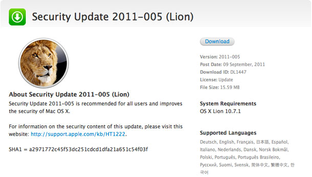 «Обновление системы безопасности 2011-005 рекомендуется установить всем пользователям Mac OS X. Оно усиливает защищенность системы.