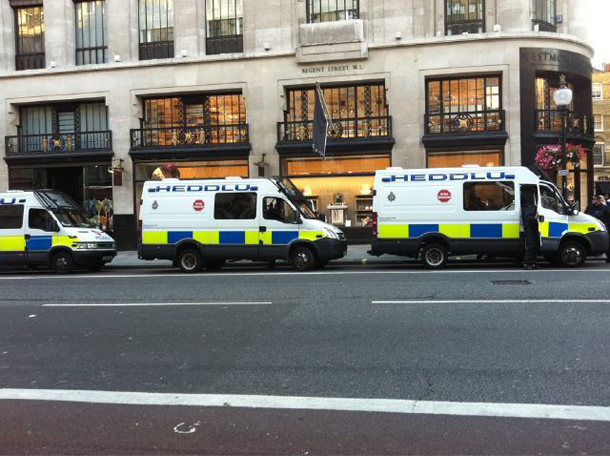 А вот к Apple Store на Риджент-стрит (Regent Street) были стянуты немалые силы Уэльской полиции. Напомним, что Риджент-стрит является одной из самых популярных улиц британской столицы, на которой расположены магазины крупнейших компаний, а том числе и флагманский магазин компании Apple.