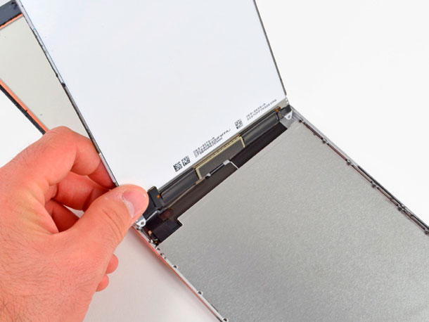 После того, как были отвинчены два скрытых и два открытых винта с помощью инструментов из набора 54 Bit Driver Kit, можно поднять ЖК-матрицу.