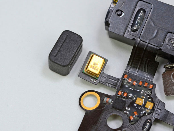 А вот и остальные два микрофона. Первый размещён на лицевой стороне в верхней части смартфона и предназначен для FaceTime и громкой связи. Второй находится на зажней стороне смартфона и предназначен для подавления шума при съёмке.