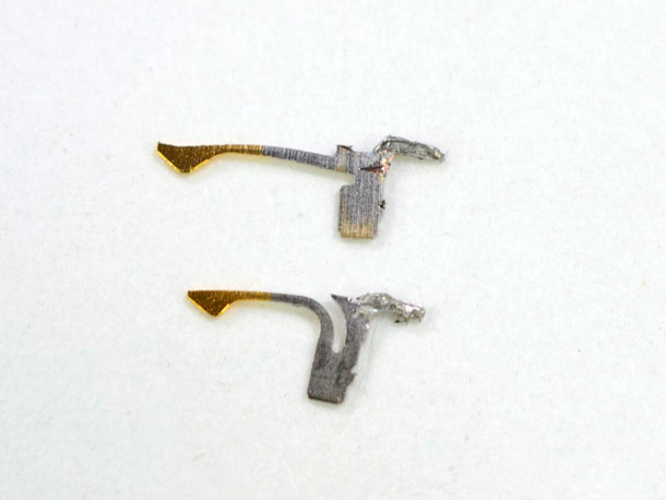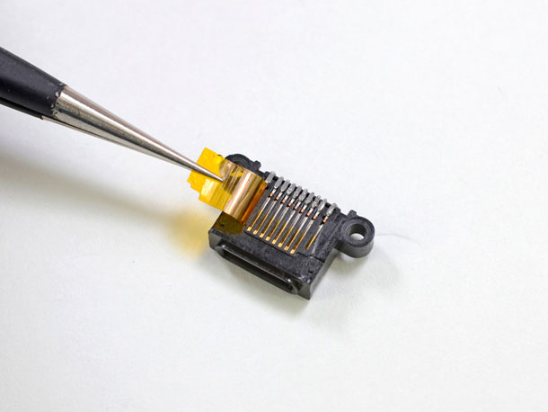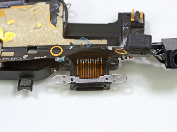 Дальнейшее исследование разъема Lightning показало, что контакты очень упругие и на конце каждого из них нанесена медь, чтобы обеспечить хорошую проводимость между шнуром Lightning и разёмом в устройстве.