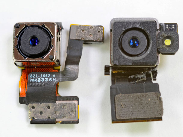 Обновленная 8-мегапиксельная камера iSight. Хотя довольно трудно увидеть различия между ней и камерой в iPhone 4S, Apple сделала несколько значительных обновлений, включая улучшенную съёмку при низкой освещенности и на 40% увеличила её быстродействие (камера iPhone 5 слева).
