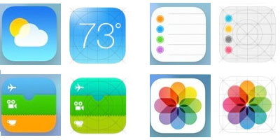 Все остальные иконки подверглись лишь небольшим цветовым изменениям: на иконке «Passbook» изменён цвет нижней вкладки с оранжевого на светло-зелёный, на иконке «Напоминания» — цвет точек, а на иконке  «Фото» — цвет одного из лепестков поменялся с жёлтого на светло-зелёный.