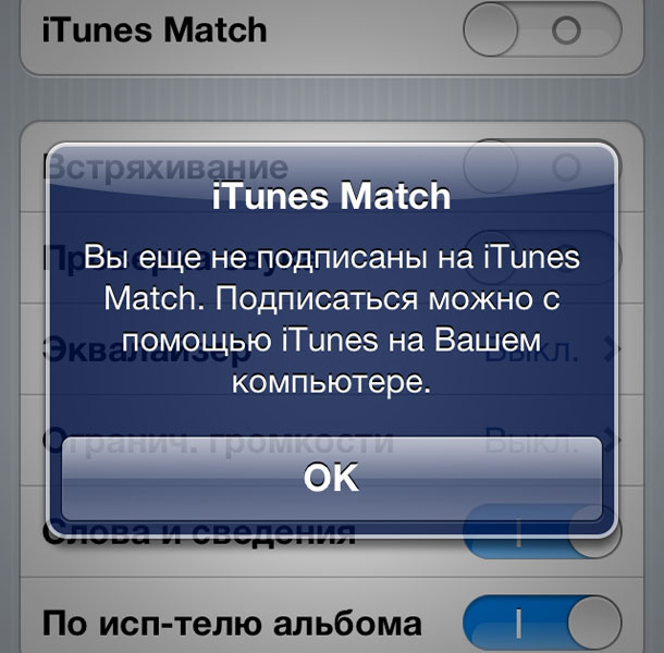 Если вы сейчас зайдёте в «Настройки» > «Музыка», то увидите там этот переключатель. При попытке переключиться к сервису iTunes Match, сдвинув переключатель в положение «ON», вы увидите запрос на подписку на этот сервис.