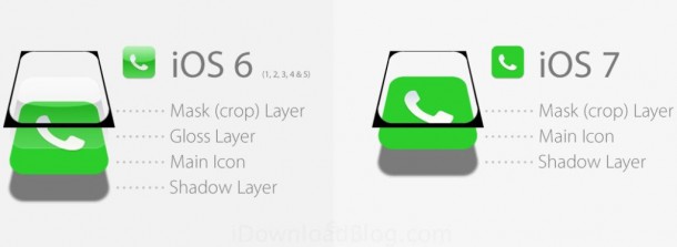 Раньше иконки состояли из трёх слоёв: первого с тенями, второго с глянцевым эффектом и третьего со скруглёнными углами. В iOS 7 не будет использоваться средний слой на иконках приложений Apple и вряд ли его смогут использовать разработчики сторонних приложений. Таким образом новые иконки будут выглядеть так.
