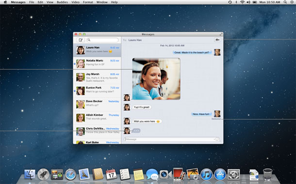 Приложение Messages делает все, что делает iChat и даже больше. Так же, как и iMessage в iOS, оно позволяет отправлять неограниченное количество сообщения на любой Mac, iPhone, iPad, или iPod Touch, работающий под управлением iOS 5. Отправляйте фото, видео, документы и контакты. Вы сможете увидеть, когда ваше сообщение будет доставлено и когда ваш собеседник начнёт набирать ответ. Включите уведомления о прочтении и он узнает, когда вы прочитаете сообщение, а благодаря шифрованию сообщений, ваша переписка останется частной.