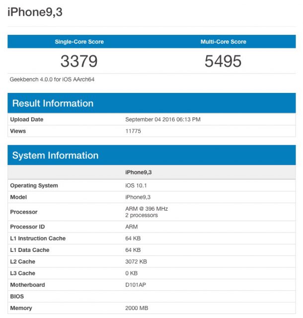 В начале текущей недели на официальном сайте разработчиков приложения Geekbench были опубликованы результаты теста производительности смартфона iPhone9,3, и как тогда утверждали журналисты PhoneArena, этот идентификатор получит новый 5,5-дюймовый iPhone 7 Plus. На тот момент было непонятно, ошиблись ли они в своих в своих предположениях или нет, так как смартфон с идентификатором iPhone9,3 имел всего 2000 Мб (около 2 Гб) оперативной памяти.