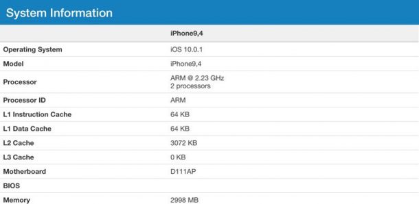 Вчера в базе данных Geekbench был обнаружен ещё один результат теста производительности, но на этот раз смартфона с идентификатором iPhone9,4, работающим на выпущенной после завершения осенней презентации Apple предрелизной сборке iOS 10.0.1 Golden Master. На приведённом выше скриншоте видно, что iPhone9,4 работает на двухъядерном процессоре ARM с тактовой частотой 2,23 ГГц и имеет 2998 Мб (почти 3 Гб) оперативной памяти, а не 2 Гб, как у смартфона с идентификатором iPhone9,3.