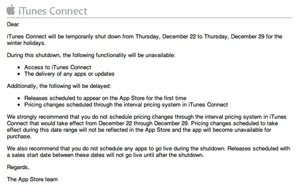 Как сообщает ресурс MacStories, Apple разослала разработчикам письма, в которых уведомила их о том, что сервис iTunes Connect не будет доступен в период с 22 по 29 декабря, т.е. на два дня дольше, чем в предыдущие годы.