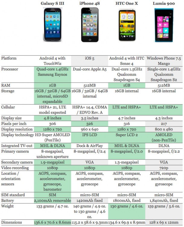 Сравнение: Samsung Galaxy S III vs iPhone 4S vs HTC One X vs Lumia 900