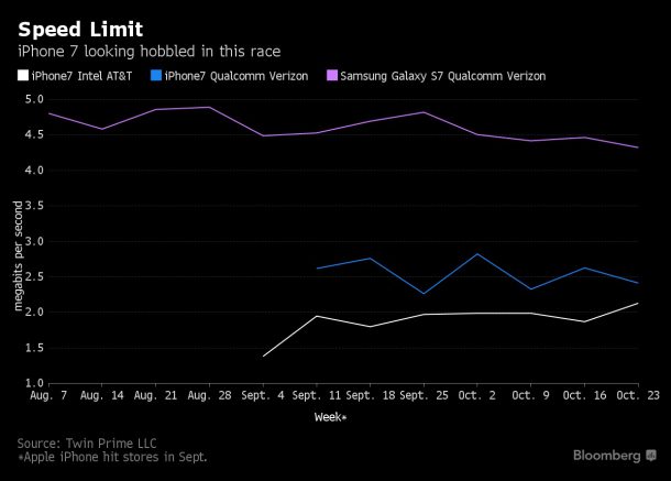 По словам Габриэля Тавридиса, главы компании Twin Prime, при идеальных условиях модем Qualcomm X12 способен развивать скорость передачи данных до 600 Мбит/с, в то время как у Intel XMM 3360 она не превышает 450 Мбит/с, но в случае с iPhone 7 и iPhone 7 Plus они демонстрируют одинаковые результаты. Ещё одним подтверждением того, что Apple программно ограничила скорость модема Qualcomm X12 в своих новых смартфонах можно считать тот факт, что тот же чип в Samsung Galaxy S7 работает вдвое быстрее.