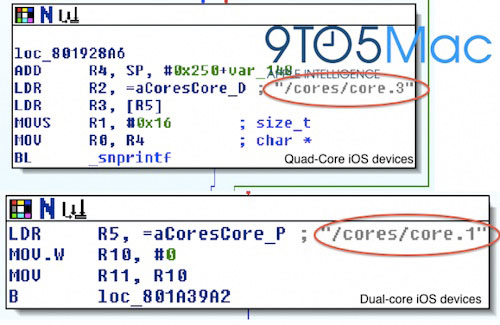 «Одноядерные процессоры, такие как А4 в iPhone 4 и оригинальном iPad обозначены как «cores/core.0», в то время как двухъядерные процессоры, такие как A5 в iPhone 4S и iPad 2 обозначены «/cores/core.1». Таким образом «/cores/core.3″ предполагают совместимость будущих устройств с четырехъядерными чипами.»