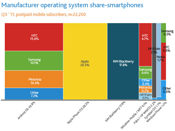 Если Android OS остается ведущей операционной системой среди смартфонов, то Apple является ведущим производителем смартфонов. На её долю приходится 28,3% всех продаваемых «умных телефонов». За ней на втором месте разместилась RIM Blackberry (17,8%), а на третьем месте — HTC (15%). Что касается южнокорейской компании Samsung, она заняла лишь пятое место (10,1%).