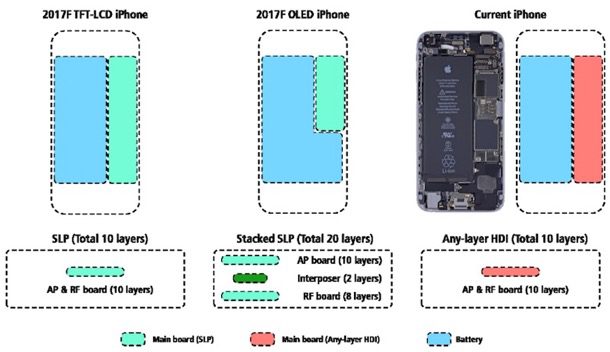 В понедельник ведущий аналитик KGI Securities предоставил инвесторам новый доклад, в котором поделился с ними новыми подробностями о спецификациях предстоящего «юбилейного» смартфона Apple, более известного как iPhone 8. По словам источников Минг-Чи Куо, по крайней мере модель iPhone с OLED-дисплеем сможет похвастаться увеличенным временем автономной работы. Они утверждают, что инженерами Apple была проведена серьёзная работа над внутренней компоновкой и им удалось видоизменить традиционную материнскую плату типа PCB (SLP) таким образом, чтобы уместить в корпусе смартфона аккумулятор повышенной ёмкости.