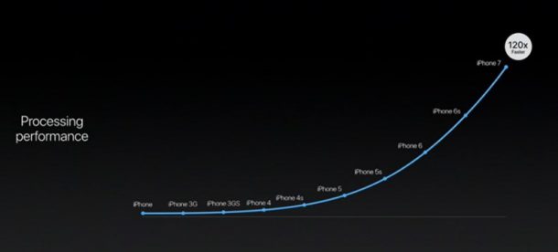 За счёт ядер высокой производительности Apple A10 Fusion работает в 120 раз быстрее процессора в оригинальном iPhone, и на 40% быстрее, чем чип A9 в iPhone 6S. При этом ядра эффективности в 5 раз экономичнее, чем ядра высокой производительности, что позволило добиться максимальной производительности и эффективности тогда, когда это требуется. В итоге, iPhone 7 работает от аккумулятора до двух часов дольше, а iPhone 7 Plus — до одного часа дольше, чем их предшественники.