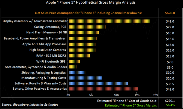 По сообщению 9to5Mac, издание Bloomberg опубликовало гипотетический список расходов на компоненты и сборку будущего iPhone 5. По этим данным, примерная себестоимость новинки составит $ 270.