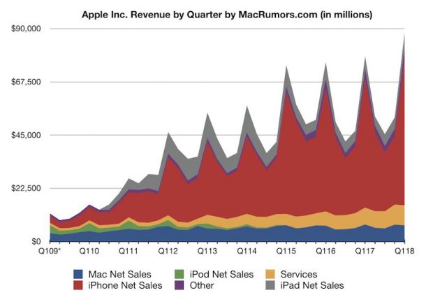 Только что глава Apple Тим Кук и её финансовый директор Лука Маэстри объявили финансовые показатели компании за первый финансовый квартал 2018 года, который соответствует четвертому календарному кварталу 2017 года. Руководство Apple сообщило о доходе компании за предыдущие три месяца, который составил $88,3 млрд. и чистой квартальной прибыли в размере $20,1 млрд. или $3,89 за акцию, по сравнению с доходом $78,4 млрд. и чистой квартальной прибылью в размере $17,9 млрд. или $3,36 за акцию, за аналогичный квартал прошлого года.