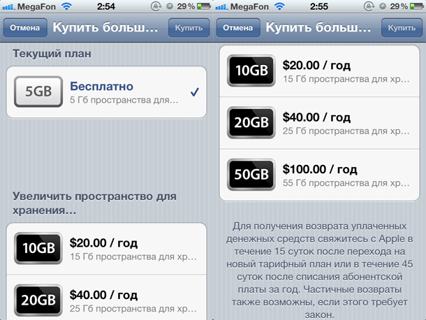 Помимо этого Apple объявила цены для дополнительных возможностей iCloud. Как вы можете видеть на скриншоте ниже, при бесплатном использовании iCloud, вам будет предоставляться 5 ГБ свободного места.