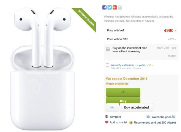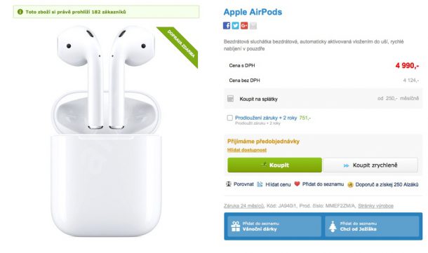 Накануне один из крупнейших интернет-ритейлеров компании Apple на территории Чехии — Alza.cz, обновил страницу своего официального сайта, на которой можно было узнать стоимость беспроводных наушников Apple. Если ранее на сайте сообщалось, что AirPods в настоящее время недоступны, то теперь чешский интернет-ритейлер Apple активировал возможность предварительного заказа AirPods и там же сообщалось, что в продаже эти наушники появятся в следующем месяце.