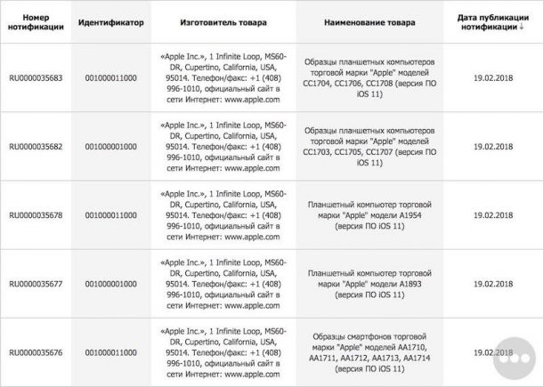 Накануне в реестре Евразийской экономической комиссии (ЕЭК), который периодически пополняется нотификациями о новых устройствах, сертифицированных для использования в том числе в Армении, Беларуси, Казахстане, Кыргызстане и России, появилась информация о прохождении сертификации новых продуктов Apple. В частности, «Единый реестр нотификаций о характеристиках шифровальных (криптографических) средств и товаров, их содержащих» пополнился записями о двух планшетах с версией ПО iOS 11 с неизвестными на данный момент номерами моделей. Речь идёт о моделях A1893 и A1954, которые не соответствуют ни одному из существующих iPad mini, iPad или iPad Pro.