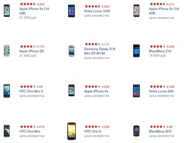 Среди малых (диагональ экрана менее 4,5 дюймов) смартфонов безусловным лидером оказалась компания Apple. Первую строчку рейтинга занял iPhone 5S, третью — iPhone 5C, пятую — iPhone SE. На втором месте расположился смартфон Nokia Lumia 1020. Прочие места в десятке разделили между собой устройства от Samsung, BlackBerry и HTC. Стоит сказать, что 11 позицию занял достаточно старый (модель 2011 года) смартфон Apple — iPhone 4S.